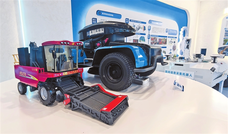 龙门实验室研发的油莎豆高效联合收获机和果园智能除草机器人模型。记者 尹江勇 摄