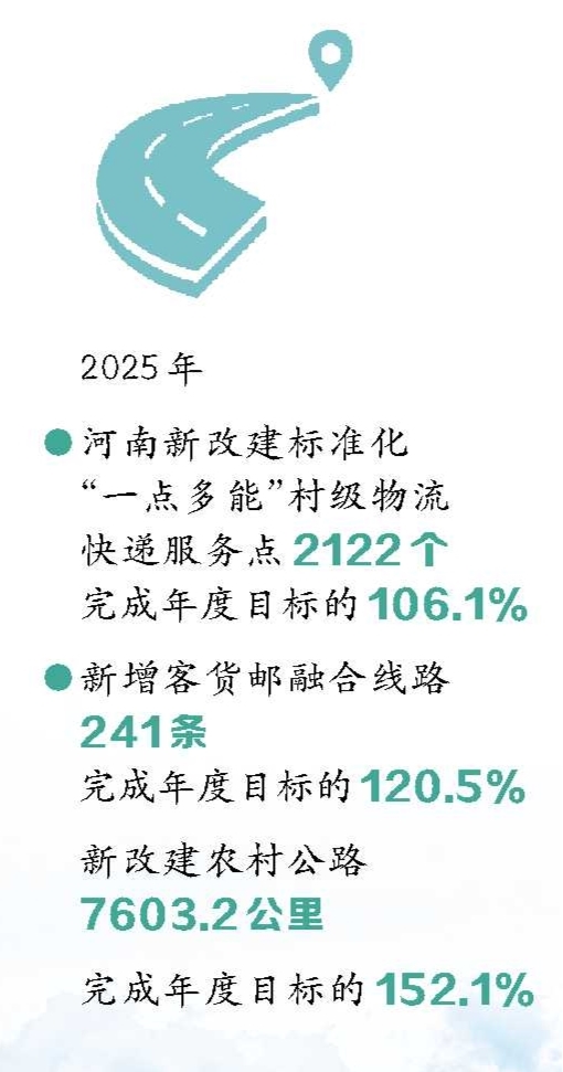 “我们聚焦政策保障、路网提质、本质安全、融合发展四大方向发力,让农村发展更持续、乡村更通畅、出行更平安、产业更兴旺。”省交通运输厅党组成员、副厅长崔梅在发布会上介绍,2025年河南新改建标准化“一点多能”村级物流快递服务点2122个,完成年度目标的106.1%;新增客货邮融合线路241条,完成年度目标的120.5%;新改建农村公路7603.2公里,完成年度目标的152.1%。“外通内联、通村畅乡、货邮到村、安全便捷”的农村公路与客货邮融合发展网络基本形成,为支撑服务乡村全面振兴交出了一份合格答卷。