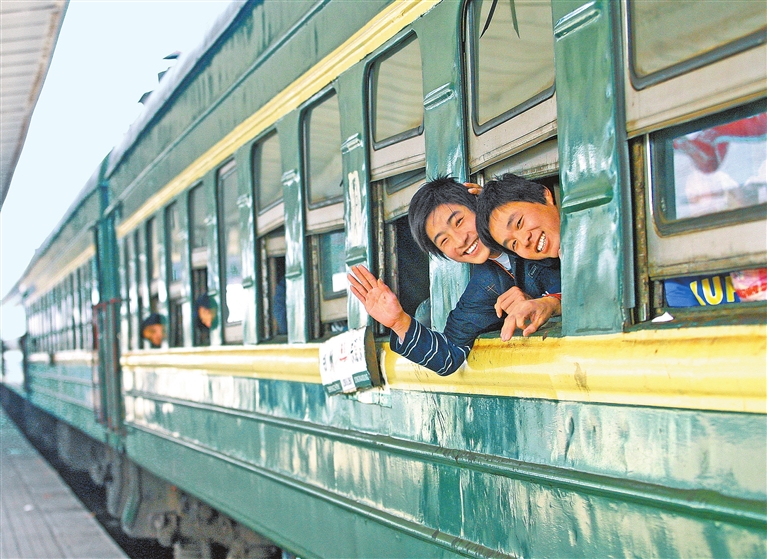 绿皮车在当年是春运的主力。2005年,几名返乡打工者在绿皮车上给记者打招呼。记者 白周峰 摄