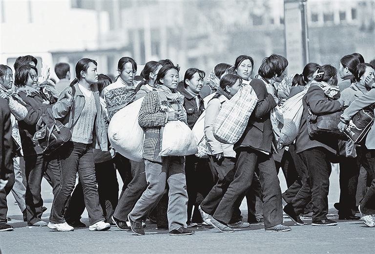 2002年的郑州火车站,乘客排队进站,“蛇皮袋”成出行标配。记者 白周峰 摄