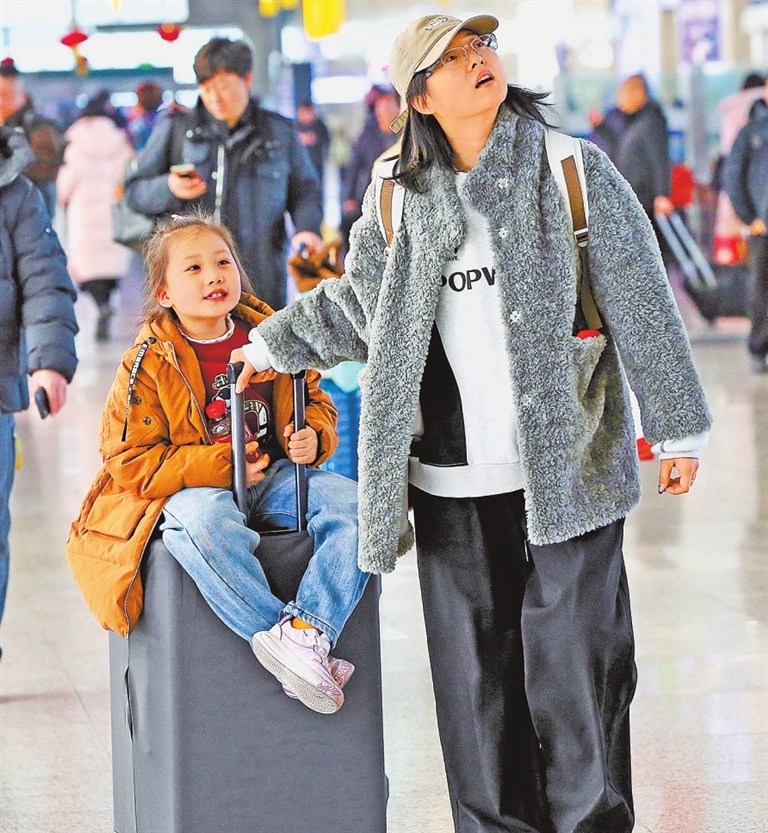2026年2月2日,在郑州东站,身着新衣的小朋友在父亲怀中等待乘车,回家路上,涌动着中国人对团圆的温暖期盼。记者 王铮 摄