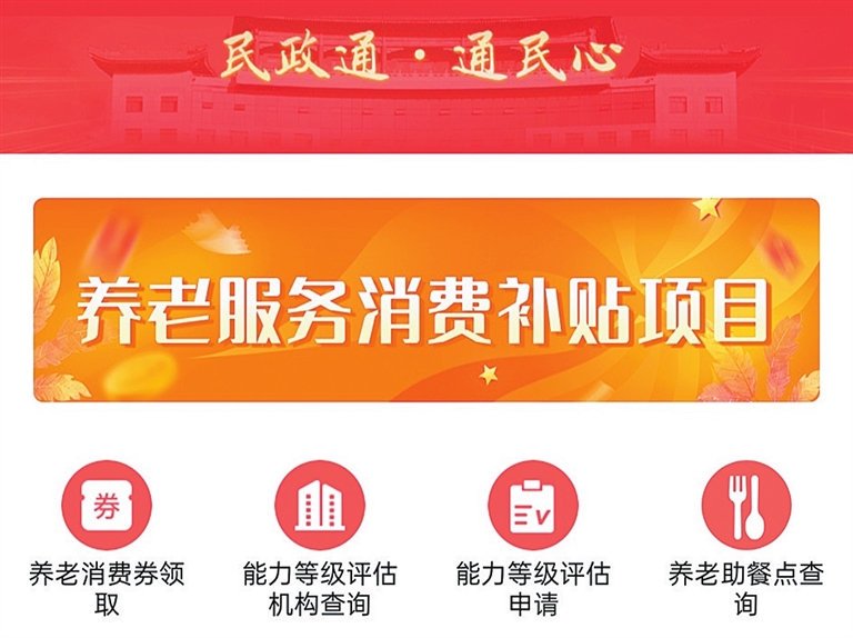 中度以上失能老年人,可以通过“民政通”小程序或APP申请养老服务消费补贴。